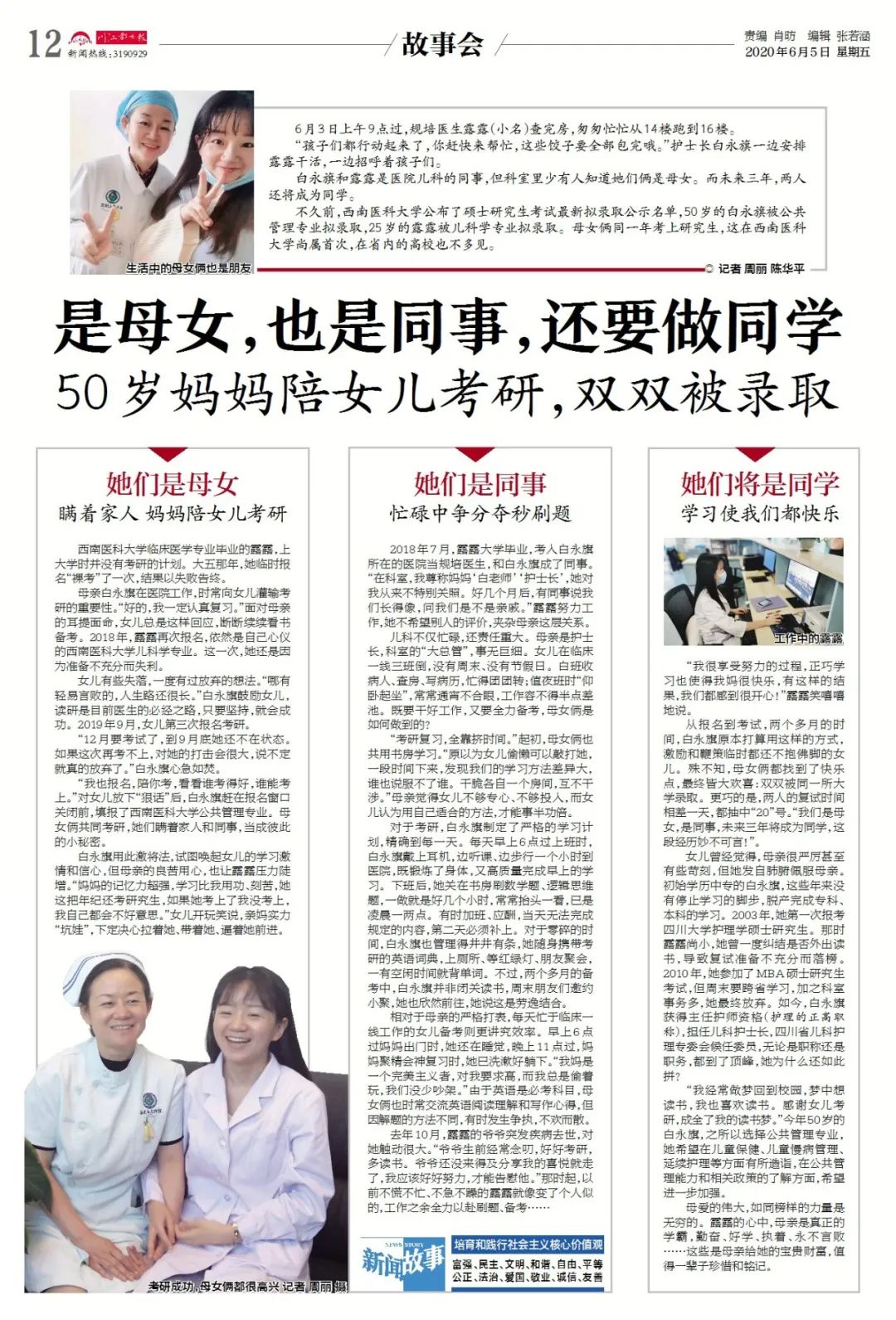 白永旗和露露是医院儿科的同事,但科室里少有人知道她们俩是母女。而未来三年,两人还将成为同学。母女俩同一年考上研究生,这在西南医科大学尚属首次,在省内的高校也不多见。