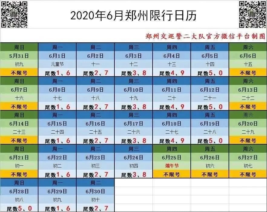 5)郑州端午节机动车限行调整:6月25日至6月27日端午节假期放假3天,为休息日;6月28日(周日)为工作日,尾数为5和0的车辆限行。