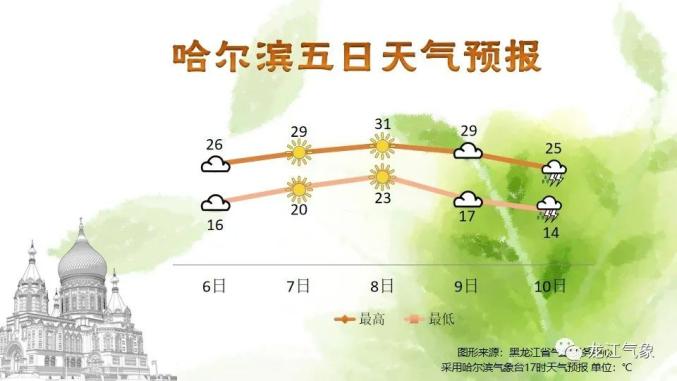 6日白天最高气温:大兴安岭20~22℃,齐齐哈尔、绥化、大庆、哈尔滨、牡丹江25~27℃,其他地区22~24℃。