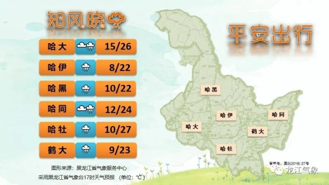 【黑龙江省气象服务中心根据黑龙江省气象台发布的晚间全省天气预报制作的省内主要高速公路天气信息】今天白天,我省大部分地区为多云有阵雨或雷阵雨天气,降雨同时局地可能伴有雷电大风、冰雹等强对流天气,请注意预防,出行的朋友请注意交通安全。另外,受降水影响,各地早晚时段气温持续较低,提示您及时关注天气和温度变化,注意合理着装。
