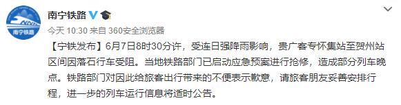6月7日8时30分许,受连日强降雨影响,贵广客专怀集站至贺州站区间因落石行车受阻。当地铁路部门已启动应急预案进行抢修,造成部分列车晚点。铁路部门对因此给旅客出行带来的不便表示歉意,请旅客朋友妥善安排行程,进一步的列车运行信息将适时公告。