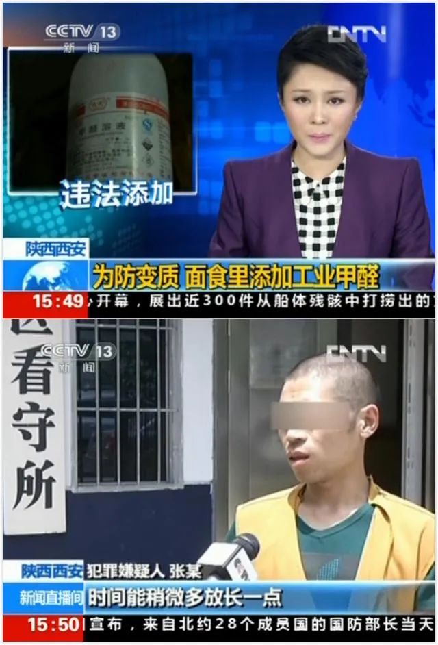 央视曾经曝光一起“劣质面粉”事件。有群众举报西安一家面店店主在面食中添加甲醛,警方经过排查摸索,最终锁定了一家叫西瑞面条店的面店,并当场查获工业甲醛一瓶。