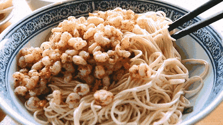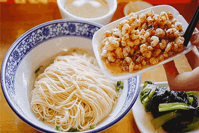 朱鸿兴面的浇头众多,尤其初夏子虾上市之时,以虾仁、虾子、虾脑烹爆的三虾面,虾子与虾脑红艳,虾仁白里透红似脂肪球,面用白汤,现爆的三虾浇头覆于银丝细面之上,别说吃了,看起来就令人垂涎欲滴。