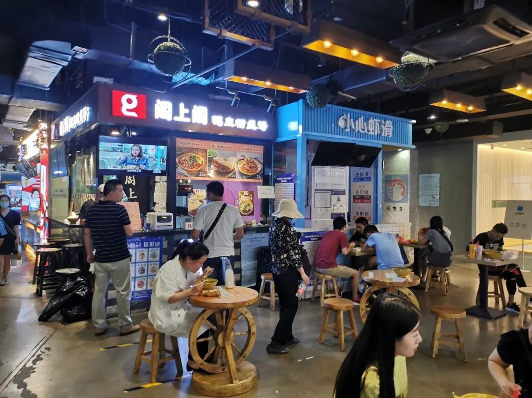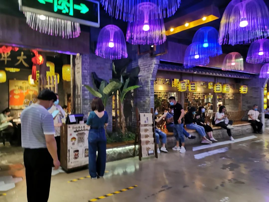 6月初,工作日晚上7点半左右,食宝街客流量达到了约平时的一半。根据店员的叙述,南京大排档在6点20左右上座率大概达到了70~80%,晚上7点时,门口开始排队等位。南京大排档从3月15日开始营业,刚复工时甚至只有几桌顾客,目前的客流量也仍不足正常的一半。这种情况下,店员只能保证基本工资,但他们表示自己并没有过多的要求。