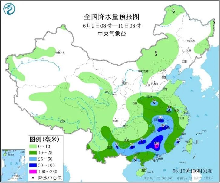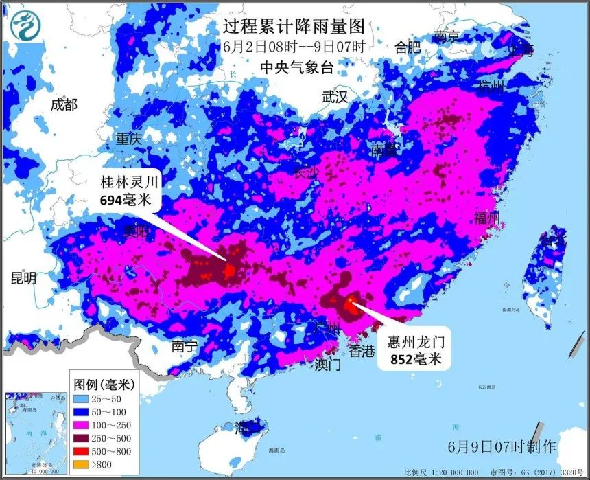 2日以来,贵州南部、广西中北部、广东中部和南部沿海、湖南中东部、江西中北部、安徽南部、浙江西部、福建西北部等地累计降雨量100~300毫米,广西北部、广东中部和珠江口以东沿海等部分地区有350~500毫米,广西桂林和柳州、广东惠州和汕尾局地达600~700毫米,广东惠州局地最大点雨量852毫米。