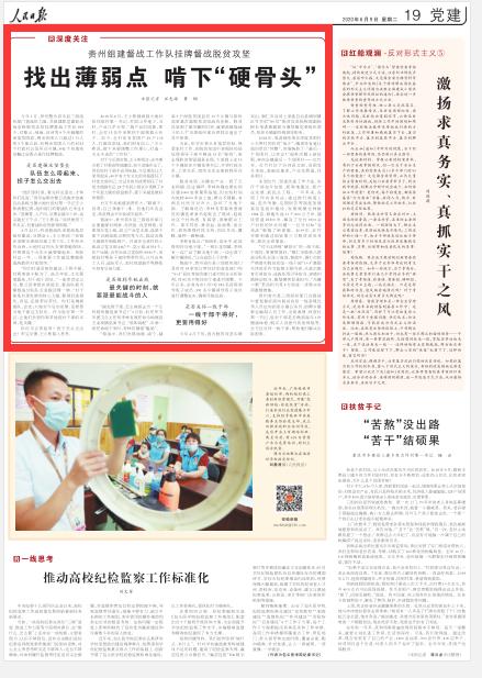 《人民日报》深度关注栏目刊发《贵州组建督战工作队挂牌督战脱贫攻坚:找出薄弱点啃下“硬骨头”》,从是否建强攻坚堡垒、是否做到尽锐出战、是否关怀一线干部等三方面,深度报道贵州省整合省市县三级组织部门督战队力量,共组建抓党建促决战决胜脱贫攻坚挂牌督战工作队699个,对紫云、纳雍、沿河等9个未摘帽的深度贫困县等进行挂牌督战情况。