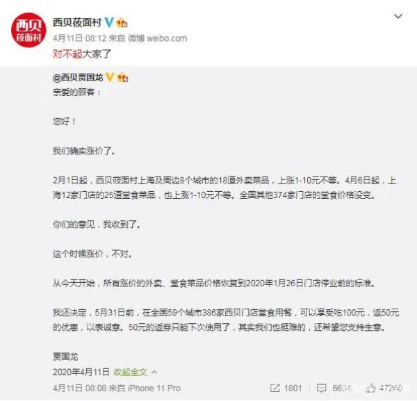 然而,事情很快出现反转。4月11日,西贝餐饮董事长贾国龙在微博发文承认西贝涨价,并称:“从今天开始,所有涨价的外卖、堂食菜品价格恢复到2020年1月26日门店停业前的标准。”