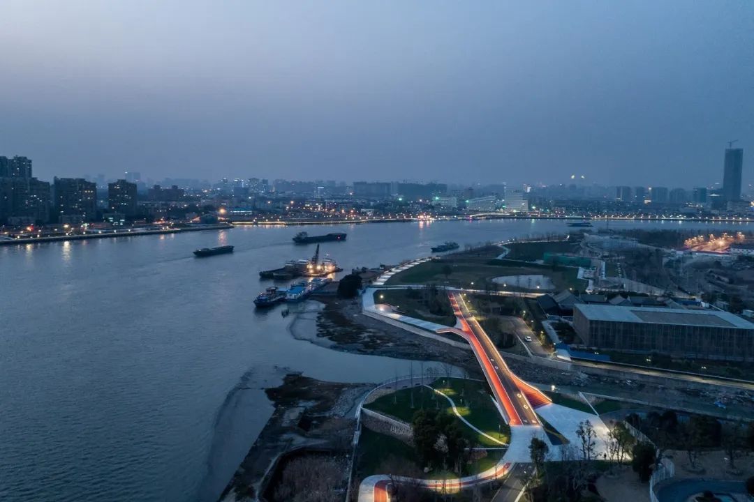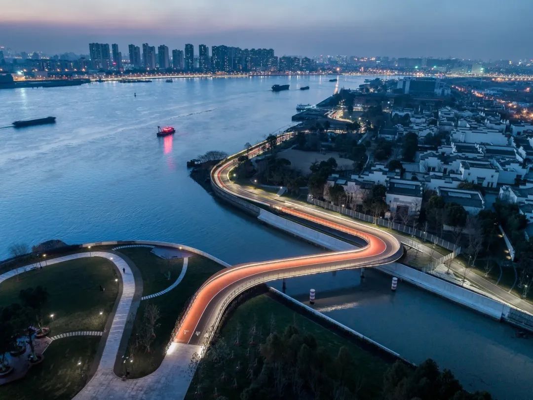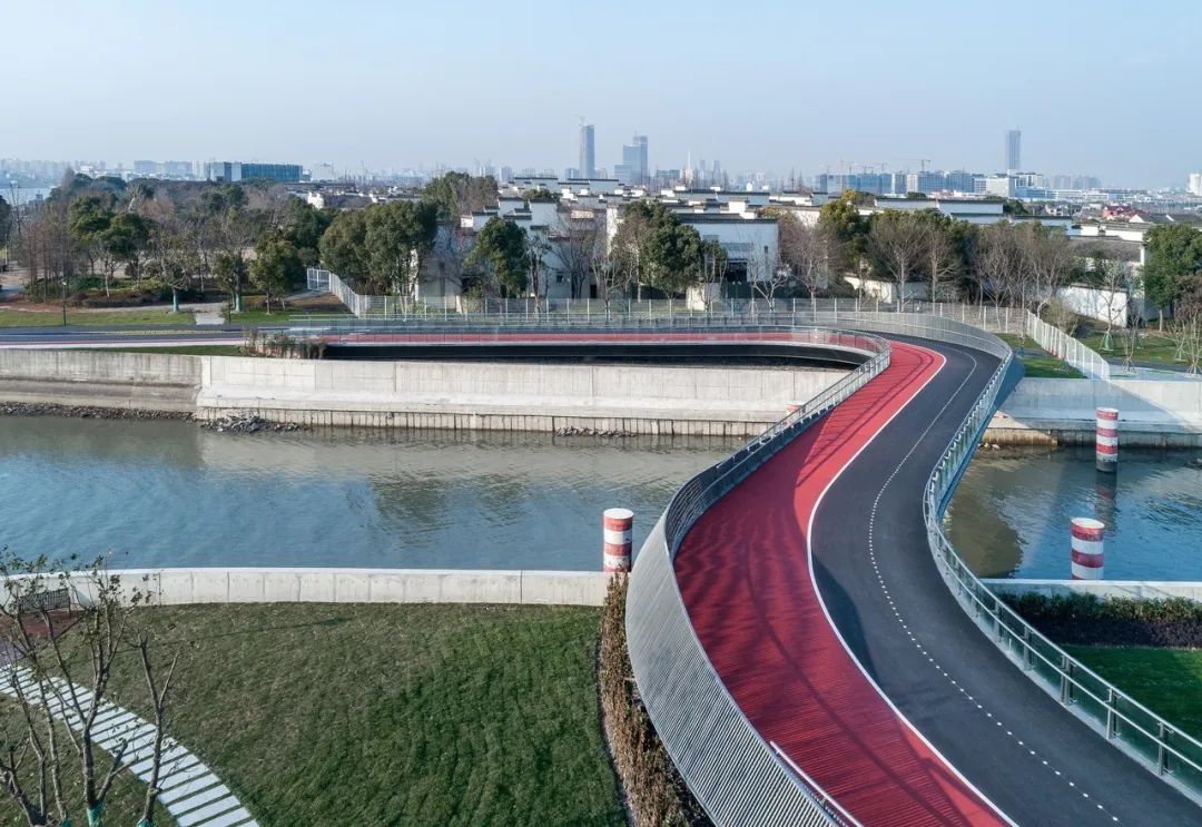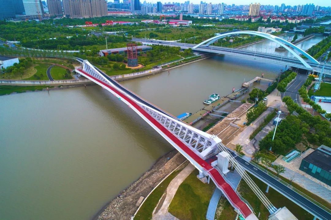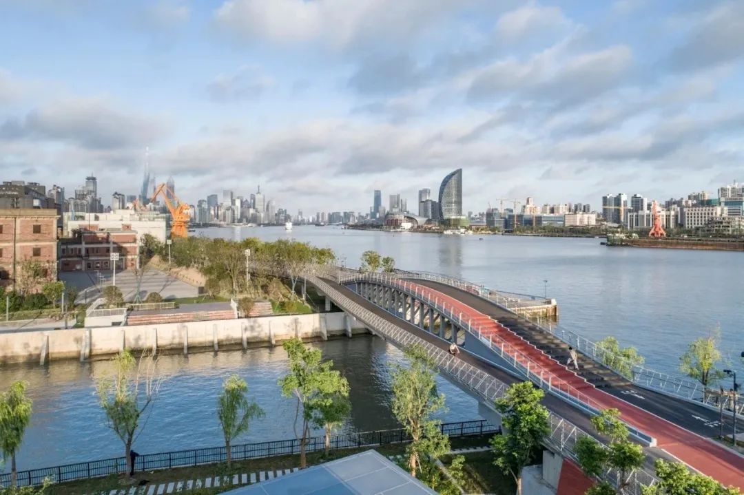 周边的三林楔形绿地也是上海中心城八片楔形绿地之一,起到滨江生态绿肺的作用。三林塘港桥既延续了传统江南水乡的韵味,又赋予了积极向上的时代图景。
