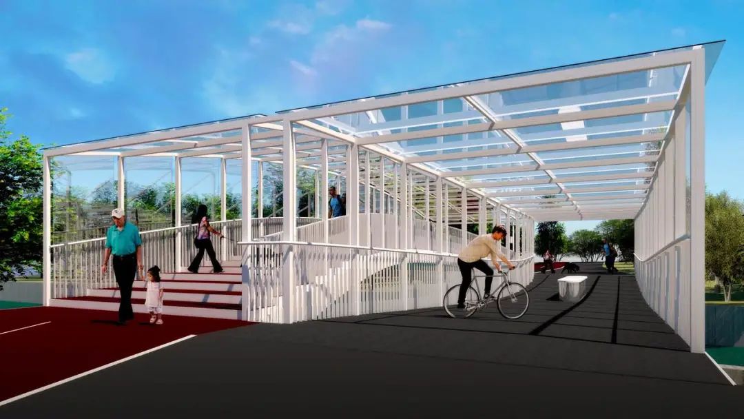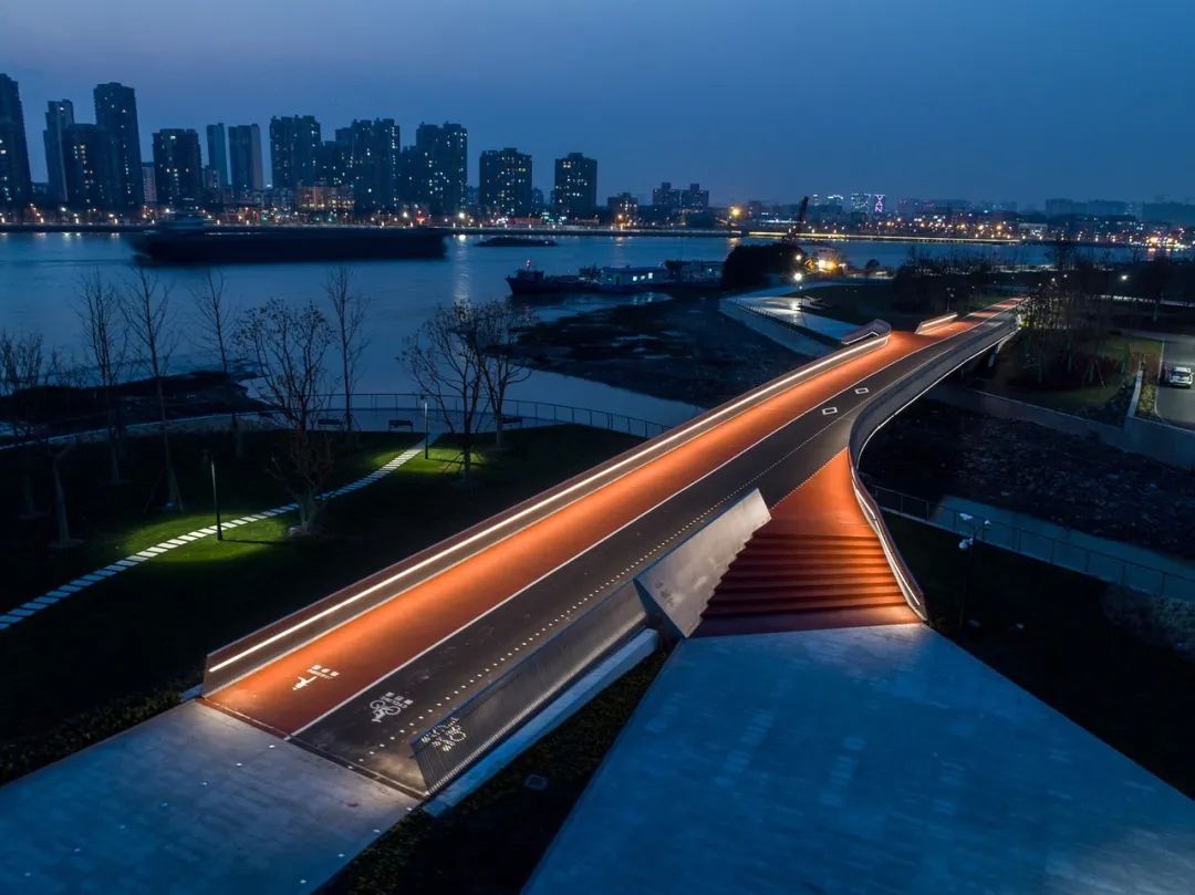 三林北港桥作为慢行系统非常重要的一个载体,以东岸滨江公共空间的设计理念应运而生,直线型的桥身直接连通南北两岸绿地空间。漫步道、跑步道、骑行道三道并行设计满足不同需求。桥头和桥尾逐渐平展出两翼,直至形成与桥身融为一体的大台阶,自然地衔接桥前的景观广场,欣赏黄浦江景色的视角。为人们真切体验城市慢生活,提供了一个新的空间。