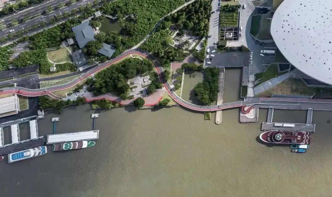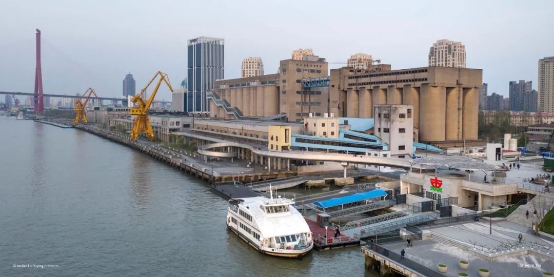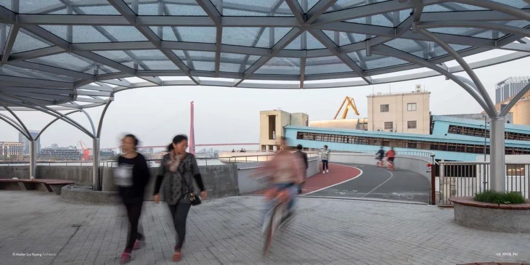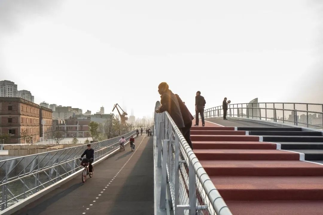 泰同栈桥,2017年底建成,桥体全长约180米,连同地面景观道路共约389米,设计师利用场地高差避让周边建筑,设计出两条宽度均为4米的步道,一条为骑行道,一条为跑步漫步道。跑步、漫步、骑行这三条路径在过去被泰同栈码头打断无法贯通,如今三股人流可以汇聚在一起,在码头二层平台处进行跨越,实现三线贯通。