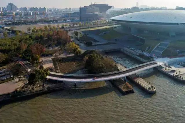 世博栈桥,2017年底建成。主桥段总长85米,为三跨连续刚构桥,两端引桥段共61米,总长近150米。设计师赋予了世博栈桥简洁、飘逸、轻盈的身姿,曲水流觞的线型桥梁映衬了黄浦江文化特色。