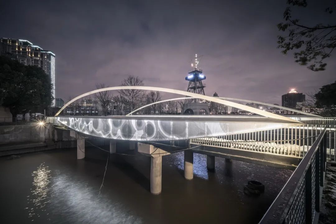 往昔岁月里,白莲泾曾有着重要的航运作用,经过长时期的沉寂,东岸贯通后它又一次成为时代的幸运儿。白莲泾桥北侧为白莲泾公园,南侧为白莲泾码头,西侧为黄浦江,桥与对岸的上海当代艺术博物馆等隔江相望。设计师在规划的时候因地制宜,把这座桥定义为人工化景观,不仅诗意地定义周边环境,还为市民提供一种流畅、愉悦的骑行、跑步与漫步体验,“拥抱式”地将黄浦江江景一览无余,给人以温暖、愉悦的感受。在对岸,市民也能在各个角度清晰地欣赏到简洁、优美的白莲泾桥。