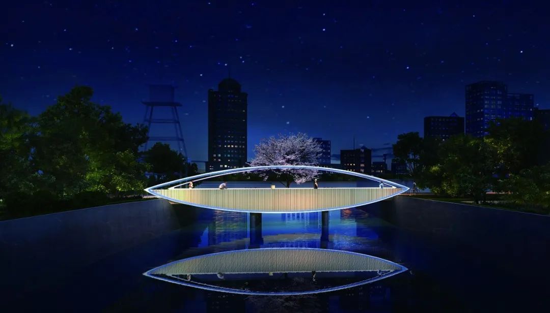 倪家浜桥包含着最经典的形式美:流水,那是长线、曲线,线与块面组成了对比美。设计师将本该是一座的桥梁拆分为两座——将自行车和跑步两股合一,采用平缓的吊桥形式通过;而漫步道单独设置,用坡度略大的拱桥作成通过和停驻的形式,一拱一吊,平添趣味。