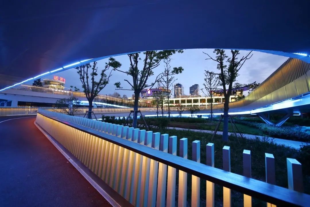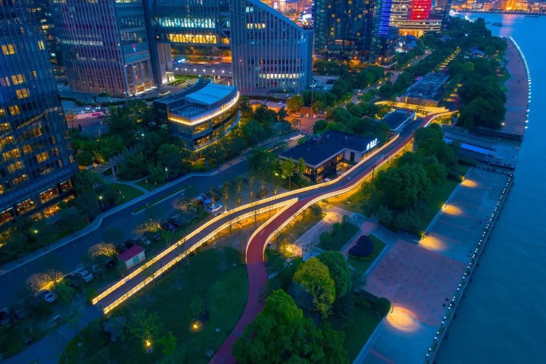 泰同栈桥贯通东侧的大都会广场和西侧的陆家嘴CBD绿地,向西南可遥望东方明珠广播电视塔,周边有5号望江驿和大都会游艇码头,桥下便是初创于1930年的泰同栈渡口。特别是当夜幕降临时,桥上的灯带透过穿孔铝板发出均匀的光亮,将整个桥体打亮,远远望去,两条轻盈的光带划过树丛倒映在江面上,犹如一件设计巧妙的“艺术品”静静地依在滨江东岸。