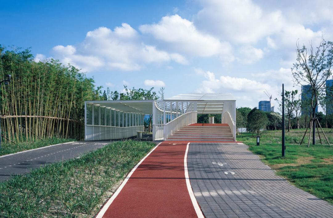 外观白色、简洁的倪家浜桥,位于耀华绿地与后滩公园分界处,东侧紧邻世博大道,西侧为黄浦江。站立于桥头,对岸江景若隐若现,而桥梁的加顶设计,相对于其他慢行桥,更是一座可为人提供遮风避雨的景观小筑。