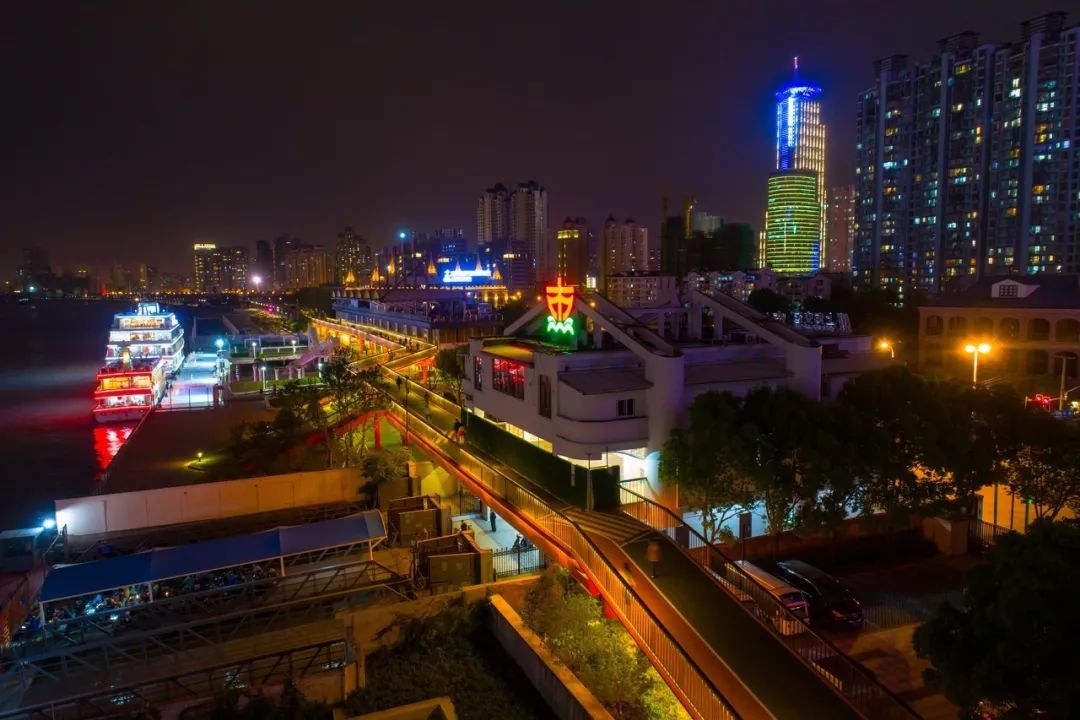 东昌栈桥,建成于2018年9月,栈桥高架步道最长约515米,桥面净宽6到7米,横跨东昌路轮渡站,使东昌路轮渡站原本的平面空间变成了立体空间,骑行道、步道的人流与轮渡站进出的人流可以相互避让,解决人流对冲带来的安全问题。与慢跑道、骑行道并立,栈桥两端呈环形结构,中间为一直线,三道依楼傍水,若即若离。