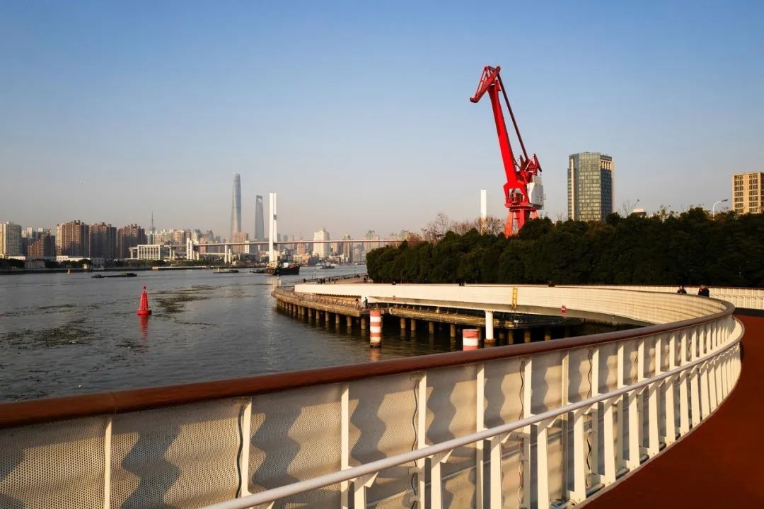 其昌栈桥,2017年底建成,主桥全长340米,宽5米。设计师巧妙地将人行漫步道、跑步道和骑行道“三线”抬升,通过心脏搭桥手术式精细施工,在空间上实现曲线柔和地过渡,满足其昌栈轮渡、东方路隧道的正常运行。