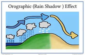 温暖潮湿的空气从海洋登上陆地,却被迎面而来的高大山脉挡住去路。它随着山的高度不断攀爬,途中遇冷凝结,降下雨雪。当终于越过山巅俯身向下时,它却发现自己变成了被拧干的毛巾,不能再给山的这一侧带来丰富的降水。