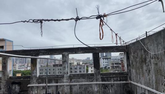 记者走访涉事大楼,发现避雷设施陈旧不堪,天台上乱拉乱搭的线随处可见,避雷带和这些线形成一张巨大的网,家属质疑这张肆意生长的网是引雷入户伤人的元凶,存在安全隐患。