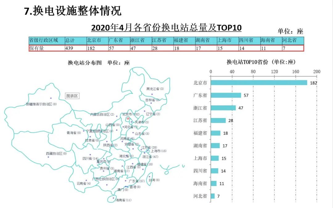 截至4月,全国共有换电站有439座,主要分布在一线城市及新能源汽车推广较好的省市。除了北汽新能源、蔚来汽车外,浙江时空电动等车企以及国家电网、南方电网等能源企业均在进行布局。