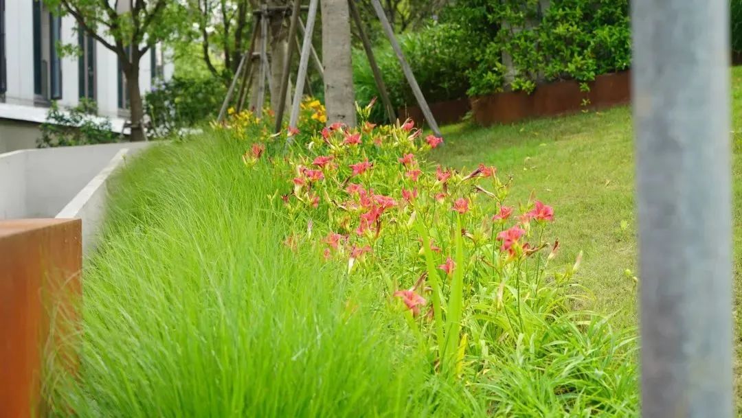 新建路绿地主要应用萱草品种金娃娃和芝加哥之火,以粉色黄色为主色调。