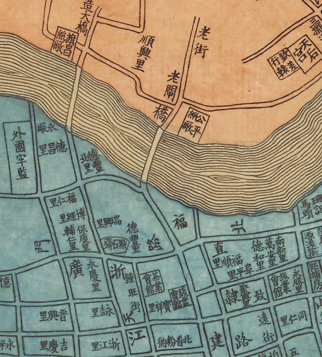 老闸以北的区域1893年被占为租界,租界当局在其1914年编制的《上海市区域北市图》之图中特意标明“闸北之东段为租界,天后宫,同仁辅元堂仍归中国官员管理”。可见“闸北”一词此时已定为一个正式的地名称呼。