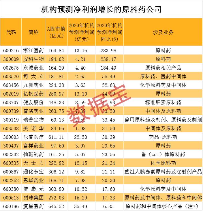 根据5家以上机构一致预测数据,19股今年净利润有望实现同比增长,浙江医药、安科生物、东诚药业等3股获机构预测净利润有望翻倍增长。浙江医药净利润预测增幅最高,机构一致预测其今年净利润为13.16亿元,同比增长283.98%。浙江医药医药制造类业务涵盖了化学原料药及其制剂产品、保健品等细分行业,其中化学原料药主要包括抗耐药抗生素原料药和抗疟疾药。