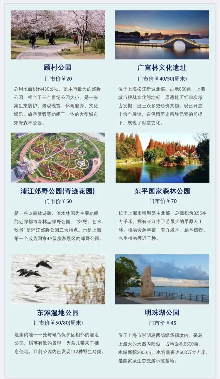 公园年票包括东方绿舟、辰山植物园、上海动物园、共青森林公园、古猗园、上海滨江森林公园、顾村公园、广富林文化遗址、浦江郊野公园·奇迹花园、东平国家森林公园、东滩湿地公园和明珠湖公园12个公园景点。门市总价最高为512元(个别公园周末和平日价格不同),具体名单如下: