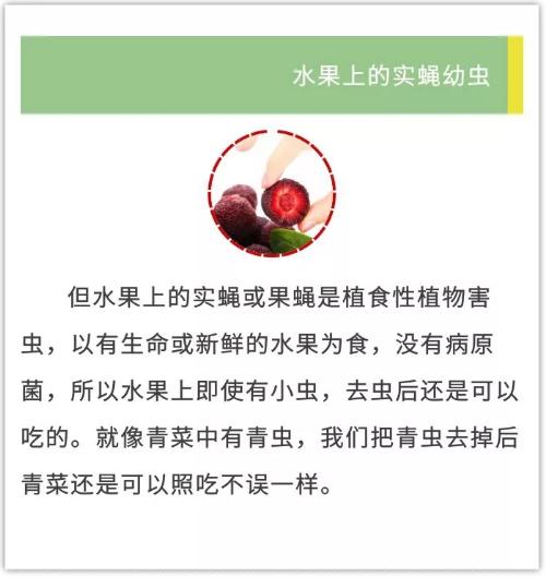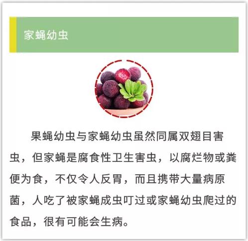 水果上有小虫,就像青菜上有青虫,并不影响食用健康和安全。杨梅等水果果肉中见到的小虫,是实蝇或果蝇等害虫的幼虫。