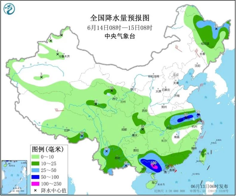 6月14日08时至15日08时,黑龙江大部、苏皖中南部、湖北东部、云南大部、华南大部等地的部分地区有中到大雨,其中,安徽中部、江苏南部、广东西南部、广西东南部等地局地有暴雨或大暴雨(100~180毫米)。内蒙古东北部、辽宁北部、广东南部沿海等地的部分地区有4~6级及以上风。