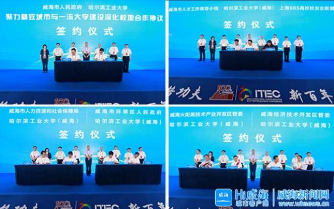 开幕式上,市政府与哈尔滨工业大学签订“聚力精致城市与一流大学建设深化校地合作协议”;市人才工作领导小组与哈工大(威海)、上海985高校校友会联盟三方签订“人才产业交流合作协议”;市人社局与哈工大(威海)签订卓越工程师(工程领军人才)培养合作协议;环翠区政府与哈工大(威海)签订校地校企战略合作协议;高区管委与哈工大(威海)签订医工结合领域产学研合作协议;经区管委与哈工大(威海)签订共建校友创业孵化基地协议。