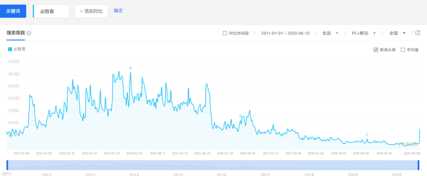 2016年必胜客的搜索热度开始明显降低 来源:百度指数
