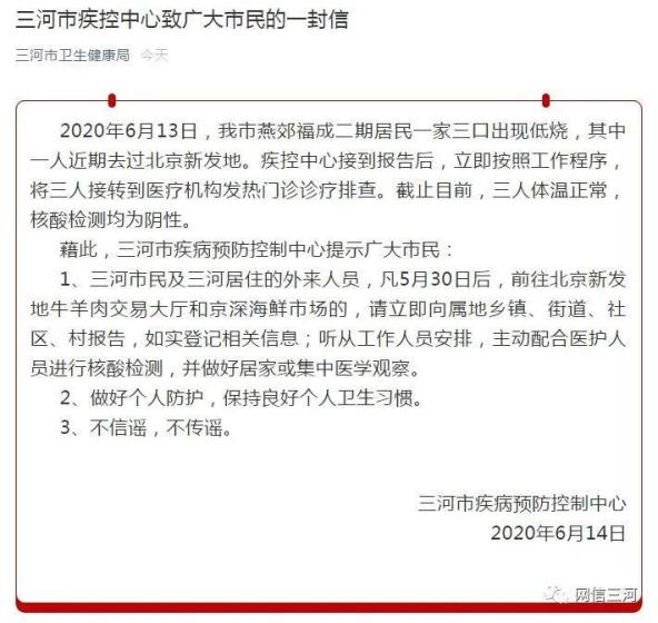 6月14日,据河北三河市网信办官方微信“网信三河”消息,三河市疾控中心接到报告后,立即按照工作程序,将三人接转到医疗机构发热门诊诊疗排查。三河市疾控中心回应称,截止目前,三人体温正常,核酸检测均为阴性。