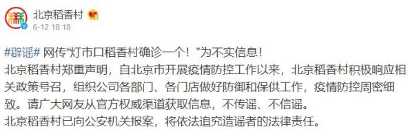 北京稻香村官方微博6月12日发微博回应:网传“灯市口稻香村确诊一个”为不实消息!