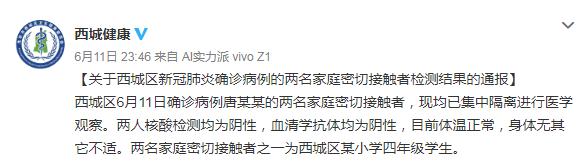 6月11日上午,对唐某某孩子进行核酸以及血清学抗体检测,结果均为阴性。截至目前,孩子体温正常,身体无其他不适。