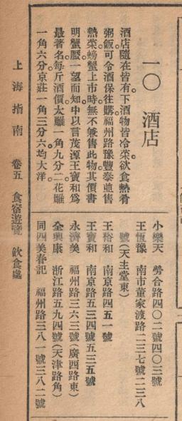 以前,上海的餐饮业划分为菜馆、宵夜馆、西餐馆、饭店、粥店、点心店、酒店、茶馆等几大类,酒店只供应酒,以及下酒菜,不供应饭和炒菜,1930年版《上海指南》在“酒店”一栏中说: