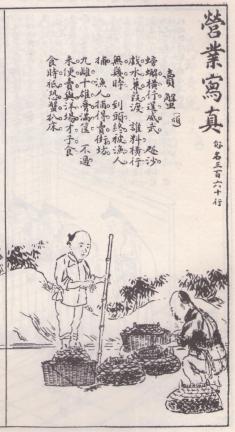 湖蟹乘潮上,簖渔者捕得之,担入城市,居人买以相馈贶, 或宴客佐酒。有“九雌十雄”之目,谓九月团脐佳,十月尖脐佳也。汤煠而食,故谓之“煠蟹”。
