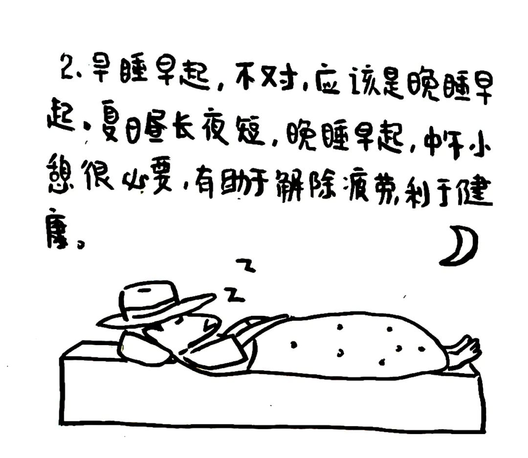 早睡早起,不对,应该是晚睡早起。夏日昼长夜短,晚睡早起,中午小憩很必要,有助于解除疲劳,利于健康。