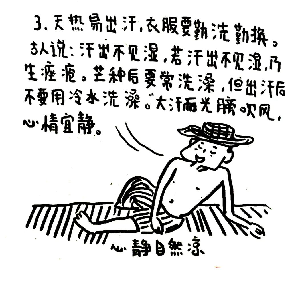 天热易出汗,衣服要勤洗勤换。古人说:汗出不见湿,若汗出不见湿,乃生痤疮。芒种后要常洗澡,但出汗后不要用冷水洗澡。大汗而光膀吹风,心情宜静。