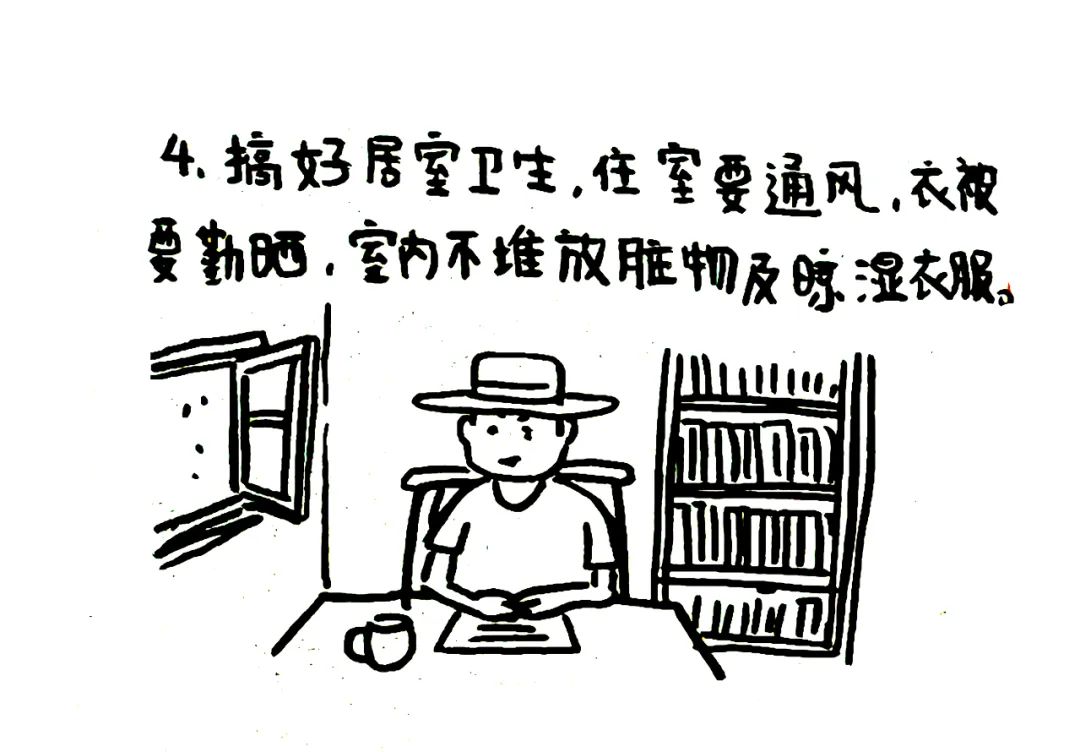 搞好居室卫生。住室要通风,衣被要勤晒。室内不堆放脏物及晾湿衣服。