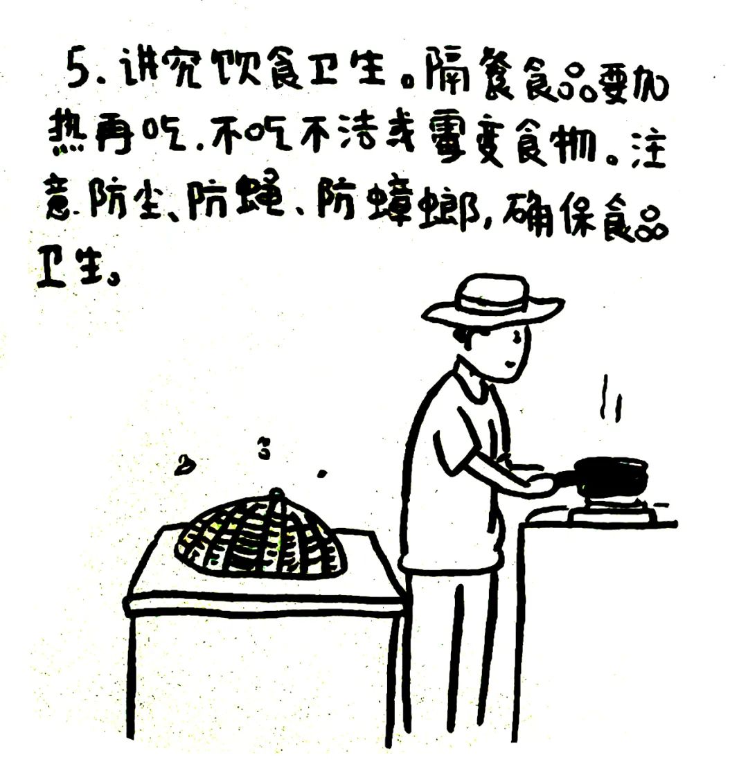 讲究饮食卫生。隔餐食品要加热再吃。不吃不洁或霉变食物。注意防尘、防蝇、防蟑螂,确保食品卫生。
