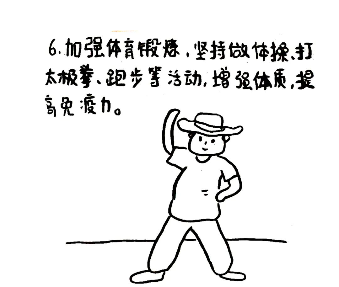 加强体育锻炼,坚持做体操、打太极拳、跑步等活动,增强体质,提高免疫力。