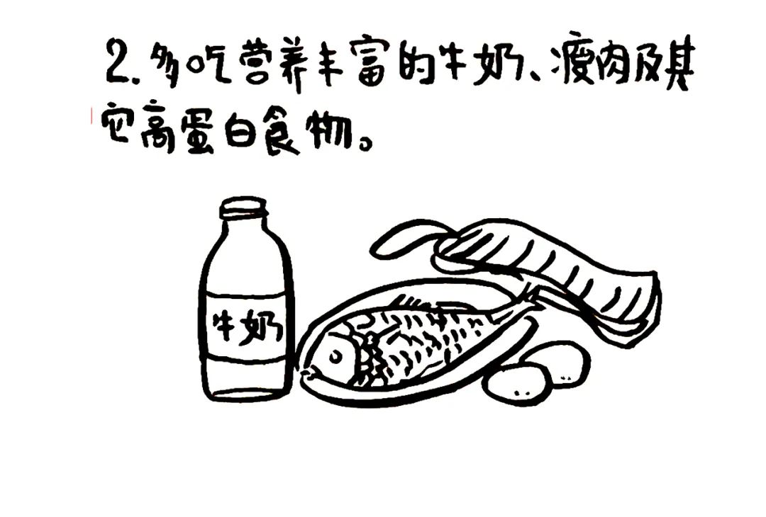 多吃营养丰富的牛奶、瘦肉及其它高蛋白食物。