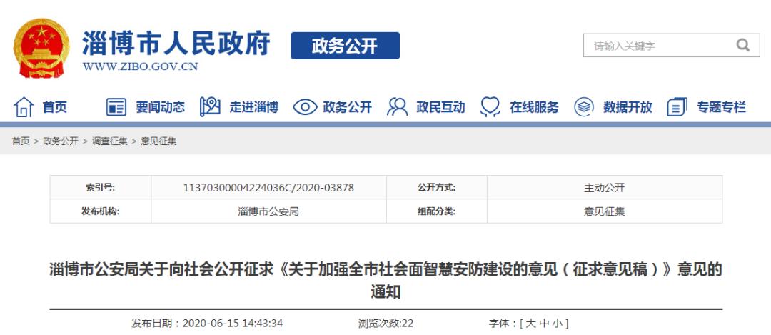 为认真贯彻落实党的十九届四中全会和习近平总书记关于市域社会治理、深化平安建设和做好疫情常态化防控的重要指示精神,进一步加强全市社会面智慧安防推广应用工作,指导社区(村)、企业、机关事业单位等行业、领域高标准推进建设,根据《全国公安机关社会治安防控体系建设指南》(公治安[2019]963号)、《山东省“雪亮工程”建设管理规范》(鲁政法[2019]26号)和《淄博市人民政府办公室关于印发淄博市新型智慧城市试点示范建设实施方案的通知》(淄政办字[2020]44号),淄博市公安局会同相关部门起草了《关于加强全市社会面智慧安防建设的意见(征求意见稿)》,现向社会公开征求意见,时间为2020年6月15日-2020年6月19日。如有意见和建议,请以书面扫描(包括建议人姓名、单位、电话及建议内容和原因,单位需加盖公章)电子邮件的方式反馈意见。