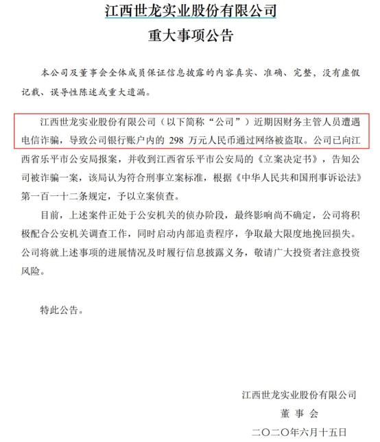 江西世龙实业股份有限公司6月15日公告,近期因财务主管人员遭遇电信诈骗,导致公司银行账户内的298万元人民币通过网络被盗取。公司已向江西省乐平市公安局报案,已被予以立案侦查。