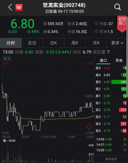 作为一家小市值上市公司,世龙实业的交易较低迷,截至6月17日收盘,世龙实业报收6.8元,收跌0.44%,市值为16.32亿元。