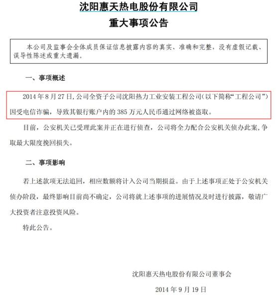 从公开信息搜索,沈阳惠天热电曾于2014年8月27日遭遇电信诈骗,导致公司账户内的385万元通过网络被盗取。据沈阳当地媒体《辽沈晚报》报道,惠天热电此次遭遇电信诈骗的财务人员当时是位刚毕业不久的女大学生,接到诈骗电话以为是好事且加班分批操作把钱转出去。尽管惠天热电报案争取挽回最大损失,但当时已公告有可能无法追回被诈骗的款项。
