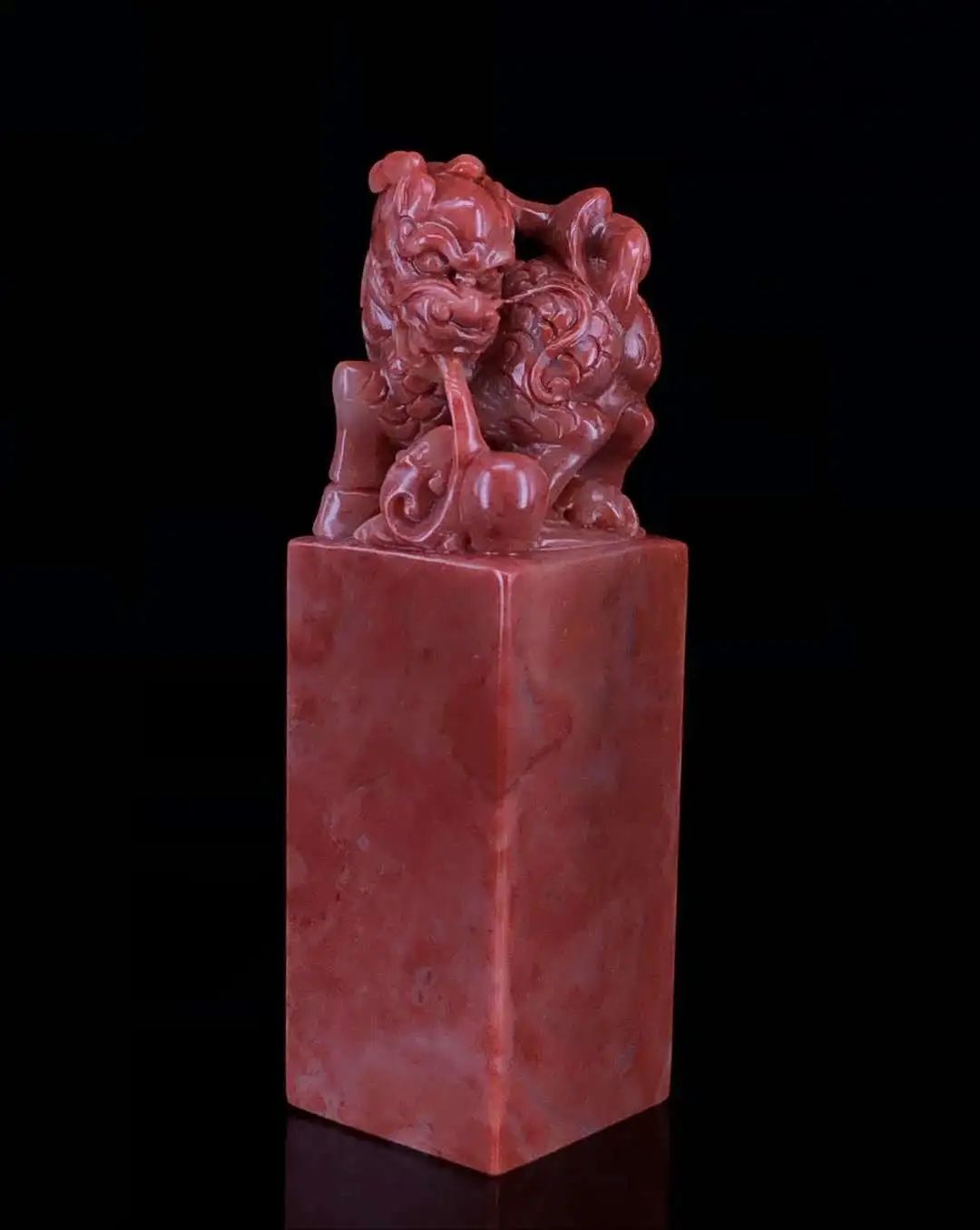 寿山芙蓉桃花结晶朱砂“麒麟献瑞”正章;质地固结,通明度强,玲珑剔透。