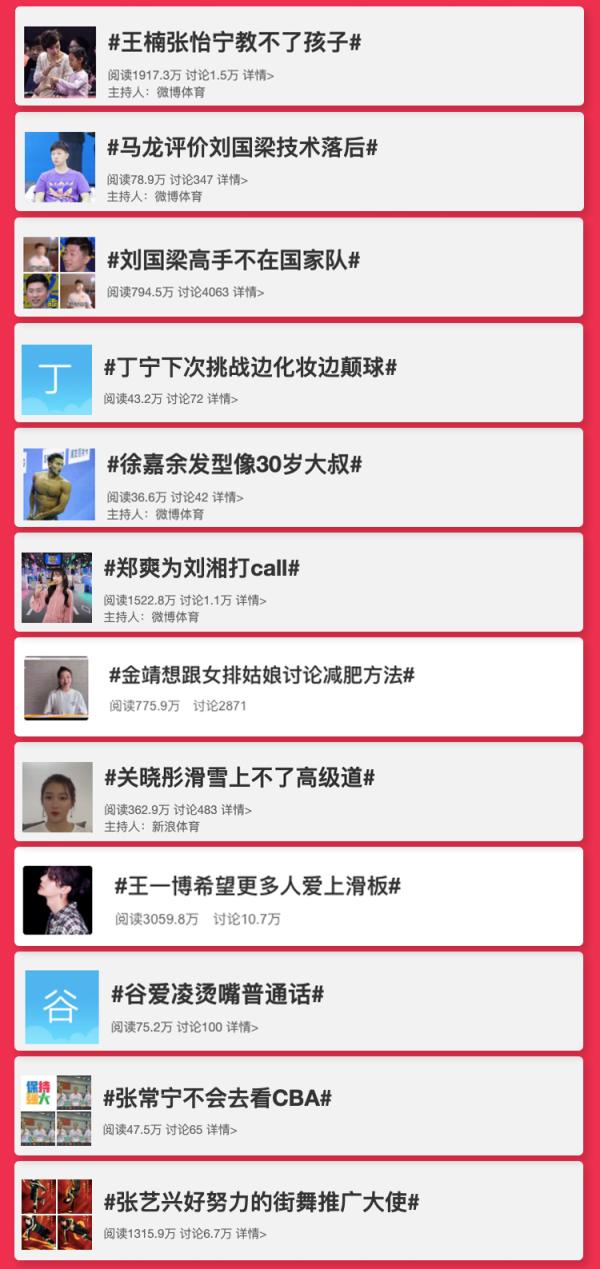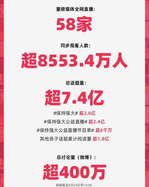根据主办方提供的数据,本场直播覆盖了全网58家直播平台,直播总观看量超过8553.4万人次,微博话题总阅读量超7.4亿,话题总讨论量超400万,成为了中国体育史上参与运动员最多、覆盖直播平台最多、观看人次最多、讨论量最多的视频连线节目。