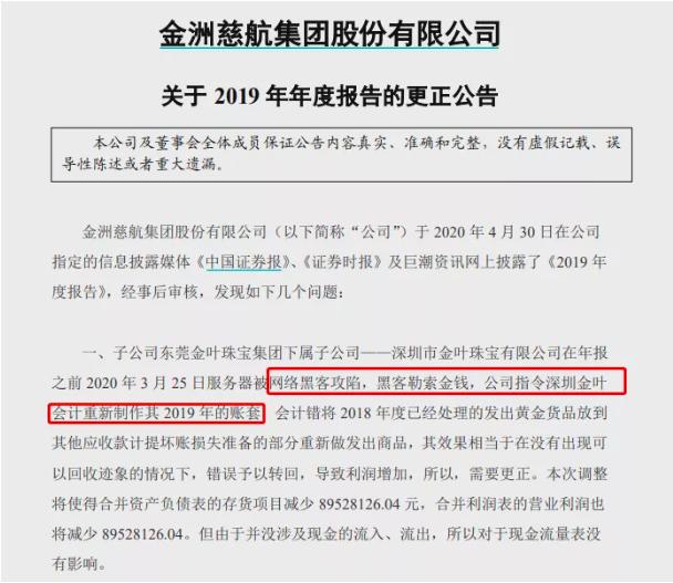 *ST金洲称,其子公司东莞金叶珠宝集团下属子公司深圳市金叶珠宝有限公司,在年报之前2020年3月25日服务器被网络黑客攻陷,黑客勒索金钱,公司指令深圳金叶会计重新制作其2019年的账套。会计错将2018年度已经处理的发出黄金货品放到其他应收款计提坏账损失准备的部分重新做发出商品,其效果相当于在没有出现可以回收迹象的情况下,错误予以转回,导致利润增加。调整后*ST金洲合并资产负债表的存货项目减少8952.81万元,合并利润表的营业利润也将减少8952.81万元。